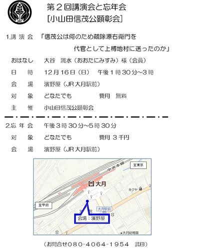 小山田信茂公顕彰会より、「第2回講演会と忘年会」の開催案内がありました。 今回の講師は顕彰会会員の方で「ご先祖・蔵徐源右衛門(延暦寺僧兵)について」の内容とのことです。お待ちしております。