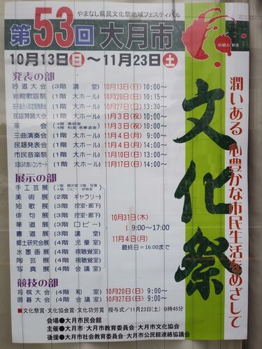 期間:10月13日(日)~11月23日(土) 場所:山梨県大月市「大月市民会館」 ・短歌、俳句、民謡、将棋、書道、将棋、囲碁他多数の展示、競技、発表あり ・笹子追分人形芝居公演 10月27日開演13:30~ ・郷土研究会展(一部借用し小山田信茂公顕彰会展示)など