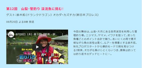8月20日午後9時~ BS日テレ 照英・秋丸美帆の最強!釣りバカ対決!!が放映されます。 場所は奈良子釣りセンター(山梨県大月市) 都心から近いので皆さん 釣りどうですか お待ちしております。